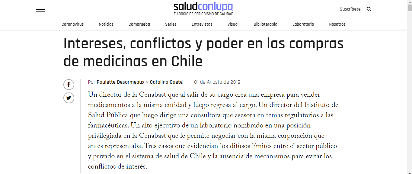 Intereses, conflictos y poder en las compras de medicinas en Chile pdesormeaux2020-05-28T17:15:11-04:00 Share This Article FacebookXLinkedInWhatsAppTumblrPinterestVkCorreo electrónico Artículos relacionados Desde Chile: 64 entidades públicas ordenaron compras de miles de test sin saber si estaban validados Desde Chile: 64 entidades públicas ordenaron compras de miles de test sin saber si estaban validados mayo 25th, 2020 | Sin comentarios https://www.occrp.org/en/fraud-factory/ Fraud Factory: the Bitcoin Fraudsters Who Trick People Around the World mayo 25th, 2020 | Sin comentarios Las grietas del milagro chileno Las grietas del milagro chileno mayo 25th, 2020 | Sin comentarios